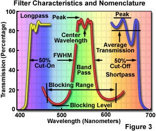 Bandpass filters (Figure 3) transmit a band of wavelengths and block all light above and below the specified transmission range. These filters are characterized with respect to optical performance by their center wavelength (CWL) and bandwidth, also referred to as the full width at half of maximum transmission (FWHM). The center wavelength is calculated from the arithmetic mean of wavelengths at 50 percent of peak transmission, while the bandwidth (FWHM) is the range of wavelengths (in nanometers) measured between the edges of the bandpass curve where light transmission is 50 percent of its peak or maximum value.