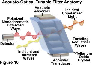 Recent advances in filter technology have yielded several sophisticated devices that feature superior performance when compared to classical absorption or interference filters, especially when utilized with laser illumination sources. Acousto-optical tunable filters (abbreviated AOTF; see Figure 10) operate by irradiating a specially prepared crystal, such as tellurium oxide or quartz, with radio wave acoustical vibrations generated by a high-frequency transducer. The result is to create the equivalent of a bulk transmission diffraction grating for light waves passing through the crystal. The filter can be tuned by varying the frequency of exciting radio waves, which enables only a very narrow band of wavelengths (often between 1 and 3 nanometers wide) to pass and eliminates the remainder by diffraction.