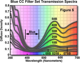 Each color-compensating filter in a series controls the amount of a single color while passing one or both of the remaining two colors. In this manner, color-compensating filters are capable of introducing either subtle changes to the color balance of the light source, or they can compensate for deficiencies in the spectral output. The visible absorption spectra for a series of blue color compensating filters (CC025B through CC50B) are presented in Figure 5. Principal minima appear in the range 380-490 nanometers for all filters in this series, which pass a majority of the blue wavelengths and filter varying amounts of green, yellow, and red wavelengths.