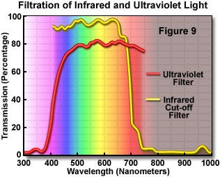Infrared cut-off filters are designed to pass visible wavelengths between 400 and 700 nanometers while blocking higher wavelengths extending into the infrared region (700 to 2500+ nanometers). These filters are often utilized to protect infrared-sensitive charge-coupled device (CCD) and complementary metal oxide semiconductor (CMOS) image sensors from infrared wavelengths. In contrast, infrared long pass filters are employed for applications that require blocking of visible light, while passing near-infrared wavelengths. New polymeric materials are being developed that have excellent characteristics for transmitting selected bands of infrared. In particular, thermoset ADC filters have very high transmission values and low haze, with significant abrasion and chemical resistance, making them ideal short pass and long pass filters for infrared applications. Figure 9 illustrates the spectral response of both an ultraviolet filter that attenuates wavelengths almost completely below 400 nanometers, and an infrared cut-off filter with very strong absorption of wavelengths above 700 nanometers.