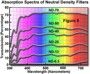 Presented in Figure 8 are the visible light absorption profiles for a series of common neutral density filters. As can be seen in the figure, these filters display a relatively constant extinction coefficient throughout the visible light (400 to 700 nanometers) spectral range. Each neutral density filter in the series, ranging fromND-0.3toND-70in Figure 8, has an incrementally lower extinction coefficient. This filter set collectively provides a uniform series of filters for adjusting illumination intensity.