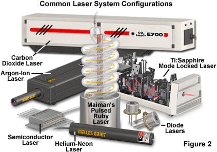 Although lasers emitting visible light are the most common, the basic principles are applicable through much of the electromagnetic spectrum. The first stimulated emission was achieved in the microwave region of the spectrum, but now lasers are available that emit ultraviolet and infrared light, and progress is being made toward producing lasers for the x-ray spectral region. Actual lasers in use today range in power output from less than a milliwatt to many kilowatts of continuous output, and some produce trillions of watts in extremely short pulses. Figure 2 presents some examples of representative lasers, which vary widely in size and application. Military and other research laboratories have built lasers that occupy entire buildings, while the most common lasers use a semiconductor device about the size of a sand grain.