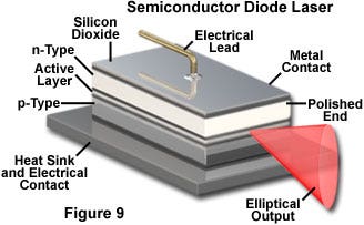 Semiconductor lasers operate in a very different fashion, but also rely on electrical currents to produce the necessary population inversion. In these devices the inversion is produced between populations of current carriers (electrons and electron-hole pairs) in the plane of the junction between dissimilar regions of the semiconductor. Light emission in a semiconductor laser is concentrated in the junction plane by feedback from the cleaved ends of the crystal (Figure 9). The chip material has a high refractive index, and reflects enough light back into the crystal to achieve gain. The cleaved face can also be polished to control the reflectivity. Typically one end of the crystal is coated with a reflective material so that emission only occurs from a single end, as illustrated in Figure 9. Much lower electrical potential and current is required in semiconductor lasers as compared to gas lasers.