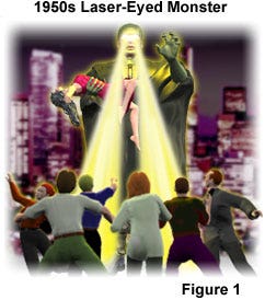 In popular science fiction videos during the 1950s, monsters were often portrayed that could emit lethal rays of light from their eyes (Figure 1), but until the invention of the laser, such concentrated and powerful energy beams were only fantasy. Now it is possible to modify, probe, or destroy matter using the highly focused radiation from energy sources known as lasers. Nearly all light that we see in our daily lives, ranging from the sun, stars, incandescent and fluorescent lamps, to even our television sets, occurs spontaneously when atoms and molecules rid themselves of excess energy.