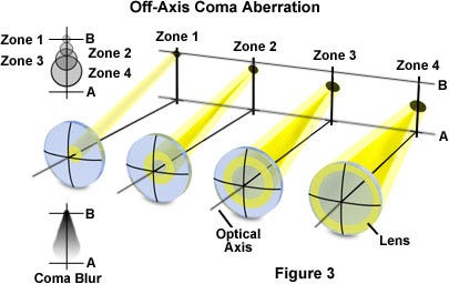 The distinct shape displayed by images suffering from coma aberration is the result of refraction differences by light rays passing through the various lens zones as the incident angle becomes more oblique (off-axis). The severity of comatic aberration is a function of thin lens shape. In the extreme, coma results in meridional rays passing through the periphery of the lens to arrive at the image plane closer to the axis than do light rays passing through the central portion of the lens (and closer to the principal ray, as illustrated in Figure 3). In this case, the peripheral rays produce the smallest image and the coma aberration is said to be negative. In contrast, when the peripheral rays are focused farther down the axis to produce a much larger image, the aberration is termed positive. The "comet" shape may have its "tail" pointing toward the center of the view field or away, depending upon whether the aberration has a positive or negative value. The degree of coma aberration is greater for lenses with wider apertures, and can be corrected (in part) by reducing aperture size. Microscope designers usually attempt to correct coma aberration to accommodate the diameter of the object field for a given objective and eyepiece combination.
