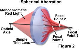 Chromatic Aberration- One of the most common faults observed in spherical lenses, chromatic aberration occurs because the lens refracts the various colors present in white light at a different angle according to the wavelength (see Figure 1). Red light is not refracted at the same angle as green or blue light so the focal point on the optical axis of the lens is farther away from the lens for red light. Likewise, green light is focused closer to the lens than red light, and blue light is focused in a plane that is closest to the lens. This phenomenon is commonly referred to as dispersion and occurs to a certain degree in all spherically shaped lens elements. The inability of the lens to bring all of the colors into a common focal plane results in a slightly different image size and focal point for each of the three predominant wavelength groups. The result is a colored fringe or halo surrounding the image, with the halo color changing as the focal point of the objective is varied.