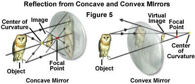 The reflection patterns obtained from both concave and convex mirrors are presented in Figure 5. The concave mirror has a reflection surface that curves inward, resembling a portion of the interior of a sphere. When light rays that are parallel to the principal or optical axis reflect from the surface of a concave mirror (in this case, light rays from the owl's feet), they converge on the focal point (red dot) in front of the mirror. The distance from the reflecting surface to the focal point is known as the mirror's focal length. The size of the image depends upon the distance of the object from the mirror and its position with respect to the mirror surface. In this case, the owl is placed away from the center of curvature and the reflected image is upside down and positioned between the mirror's center of curvature and its focal point.