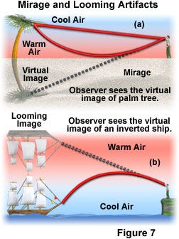 Another form of mirage, termed looming, occurs when warm air lies over a layer of cooler air, and is common over large bodies of water that may remain relatively cool when the air above the water is heated during the day (see Figure 7(b)). Light rays from an object, such as a ship on the water, traveling upward through the cool air into the warmer air are refracted downward toward an observer's line of sight. The rays then appear to originate from above the object and it appears to "loom" above its actual position. It is common for ships at sea near the horizon to appear to float above the water.