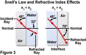 Figure 3 illustrates the two cases just described for n(1) greater than n(2) and n(1) less than n(2) for an arbitrary incidence angle of 45 degrees. The media consist of air and water with refractive indices of 1.000 and 1.333, respectively. On the left-hand side of Figure 3, a light wave passing through air is incident upon an aqueous surface at a 45-degree angle, and is refracted upon entering the water at a 32-degree angle from the normal. When the situation is reversed, a light ray having the same incident angle in water is refracted at a 70-degree angle when passing into air.