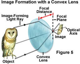 Refraction of light is an important aspect in the physics of lenses, especially with regards to how a single lens or multi-lens system is designed and constructed. In a simple convex lens, light waves reflected from the object are collected by the lens and refracted towards the optical axis to converge on the rear focal point (Figure 5). The relative position of the object with respect to the front focal point of the lens determines how the object is imaged. If the object is positioned beyond twice the distance of the focal point from the lens, then it appears smaller and inverted and must be imaged by an additional lens in order to magnify the size. However, when the object is closer to the lens than the front focal point, the image appears upright and larger, as can be easily demonstrated with a simple magnifying glass.
