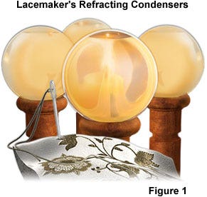 Early nineteenth century lacemakers relied on water-filled glass spheres to focus or condense candlelight onto small areas of their work in order to help them see fine details more clearly. Figure 1 illustrates a lacemaker's condenser made in the 1800s, which consists of several glass spheres arranged in a circle around a candle stand, enabling light from the candle to be focused or concentrated into several bright spots. The curved surface of the glass sphere functions as a large collecting surface for the light rays, which are then refracted toward a common focal point in a manner similar to that of a convex lens. Condensing or collecting lenses are also utilized in modern microscopes and other optical instruments to concentrate light, relying on the same principles of refraction as did the early lacemaker's condenser.