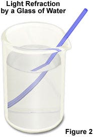 For centuries, man had noticed a rather odd, but obvious fact. When a straight pole or stick is partially submerged in water, the pole no longer appears straight, but slants off at a different angle or direction (see Figure 2 for an illustration of this effect with a soda straw in a glass of water). Light is refracted when it leaves water, giving rise to the illusion that objects in water appear to be both distorted and closer than they really are. The straw in Figure 2 appears magnified and slightly distorted due to refraction of reflected light waves from the surface of the straw. The waves must first pass through the water, then through the glass/water boundary and finally through the air. Light waves coming from the sides (front and back) of the straw are shifted to a greater degree than those coming from the center of the straw, making it appear larger than it really is.