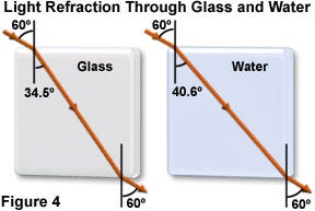 Another aspect of the refractive index concept is illustrated below (Figure 4) for the case of a light beam passing from air through both glass and water and reemerging into air. Notice that while both beams enter the more refractive material through the same angle of incidence with respect to the normal (60 degrees), the refraction for glass is approximately 6 degrees greater than that for water due to the higher refractive index of glass.