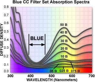 Nominal peak densities of blue color compensating filters are listed in Table 1, along with the expected exposure increase in f-stops for this series of filters.