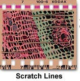 Long thin scratches that run parallel to the length of a filmstrip are caused by tears and partial removal of the emulsion by mechanical force. This usually occurs during squeegeeing, but can also occur in the camera back or during processing. Check the film pressure plate on the camera back for damage or raised areas that might be scratching the film as it advances or rewinds. If the film has been forcefully loaded into the developing spool, sometimes the emulsion is rubbed too hard against the spool, causing blemishes. Film bulk loaders are often the source of scratched film, but this is usually not obvious until the film has been processed. If the error occurs repeatedly, then carefully examine film loading and darkroom technique to uncover the source of the problem. Film that has been damaged in this manner cannot generally be repaired, but one remedy (for printing and scanning purposes) is to gently rub some skin oils (from the forehead or nose) into the scratches for a quick fix. Eventually the oil will collect dust and should removed with film cleaner before storing the transparencies.