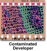 In many instances it is difficult to distinguish between errors that occur during processing and those that arise as a result of mishandling the microscope. Some errors are extremely subtle in nature, such as small contrast discrepancies and unusual density shifts, but others are often blatant. A variety of the most common errors encountered in color negative film processing are discussed in the paragraphs below with accompanying illustrations derived from photomicrographs of the specimen described above.
