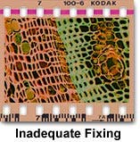 Inadequate fixing usually results with incomplete removal of all the sensitizing dyes and silver halide in color negative film emulsions. A consequence of this is a shift of the emulsion towards red and green color casts and an undesirable milky or cloudy appearance of the negatives. This error occurs when the fixer has been diluted by excessive solution carryover (in large processes), inadequate fixing time, underreplenishment, and fixer sulfurization. The process temperature has very little effect on fixing rate if all other fixer solution conditions are within tolerances. In some instances, a lack of agitation may cause incomplete fixing of the negatives. Color negatives that suffer from inadequate fixing are easily remedied by reprocessing in the fixing solution for the appropriate time.