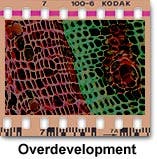 Overdevelopment with color negative films in the C-41 process leads to very dark contrasty negatives that have dense highlights lacking in detail with a dramatically increased grain size. In many instances, edge numbers and letters often appear very dark, too. This error can occur when film is left in the color developer for more than the recommended time, even when specifically intended during push-processing (which, by its nature increases grain size). The same effect will occur if the temperature is too high or the agitation is too vigorous. Carefully monitor the water bath temperature during the C-41 process, especially when using the color developer solution. The temperature should remain at 37.8 degrees Centigrade without any significant deviation to avoid process errors. Other bath temperatures (bleach and fixer) are not as critical and can afford a few degrees of fluctuation.