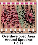 Repetitive streaks originating from the sprocket holes and traveling down into the emulsion are caused by too much agitation of the developer solution. The primary goal of agitating the first developer solution is to ensure an even spread across the film surface and to continuously replenish depleted chemicals in the area immediately adjacent to the emulsion. Excessive agitation can force too much fresh developer into contact with the emulsion, causing an overdevelopment problem. The solution to this processing error is gentle, yet sufficient agitation of the film according to the manufacturer's specifications during processing. Overdeveloped film is often damaged beyond repair and should usually be discarded. Exceptions do occur however, and film that is not too overdeveloped can sometimes be printed satisfactorily.