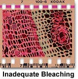 If color negative film is inadequately bleached, the result is less than normal amounts of cyan dye is formed because some of the dye remains in the leuco (colorless) condition. Often, film that has not received enough time in the bleach solution will have an overall red cast or small red spots (from lack of cyan dye) on the emulsion. Another indication of inadequate bleaching is the presence of a grayish-brown fog on highlights with corresponding shadow detail that is lacking or too dark. This is due to retained silver salts that have not been removed by the bleaching chemicals, either because of insufficient agitation, process time, or a depleted solution. In many cases, bleaching errors can be corrected by rolling the film back onto reels and re-bleaching the entire roll. This remedy will only work if the film has not been subjected to fixing in the stabilizer bath.