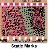 Static marks occur when film is unrolled too quickly in a darkroom under conditions of extreme low humidity, usually during the winter season. They appear as scratches, spots, or lightning-like black lines caused by static electricity that is prevalent in dry conditions. Static marks can also be caused inside the camera back or in bulk loaders when film is advanced or rewound too rapidly in dry weather. To avoid this problem, always take precautions when loading or unloading cameras and developing tanks when the relative humidity drops below 35 percent, especially in high pressure areas. Film, whether processed or unprocessed, should always be handled carefully using cloth gloves to avoid static discharge and other forms of mechanical and chemical damage.