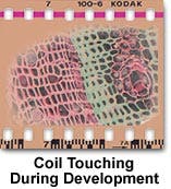 Squeezing reels too tightly in the developing tank can also cause film to overlap and touch. When this occurs, developing solution is prevented from reaching the film emulsion at the point of contact, and the film will not be adequately processed. In most instances, the affected area will remain totally unprocessed and opaque, but can become clear if the film separates later in the development process. To avoid the problem, check to ensure film is winding correctly on the reel, and listen for crackling or other unusual sounds when loading film reels in the darkroom. If the winding doesn't proceed smoothly, unwind the film and start over again.