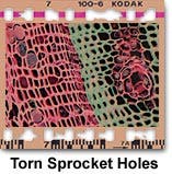 Torn sprocket holes can be an indication of a serious problem with the camera or darkroom procedures. Generally, damage to sprocket holes (the perforations used by the takeup spool to advance the film) occurs because of a problem in the camera advance mechanism. Frequently, the problem is caused by rewinding the film by force without first engaging the rewind mechanism (a button on the camera body). Another common cause of torn sprockets is trying to forcibly advance film after the end of the roll is reached. In many instances, the film is torn off the spool, compounding the problem. When the film has been mishandled during loading or unloading of the developing tank, damage to sprocket holes can also occur. This is because film is usually loaded into spiral grooves in a plastic or metal spool before being placed in the development tank. If the film is forced into the grooves or rapidly extracted, some damage can occur if one of the sprocket holes becomes caught in the reel or spool. To investigate this type of damage, carefully examine the camera back to determine if the problem lies with the takeup reel or some other portion of the film advance mechanism. If not, then review darkroom technique to see how it can be improved.