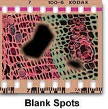 Large blank spots or patches on the emulsion surface are usually either opaque or very dark in shade when viewed on color negative film. Occasionally, blank patches will appear clear on the negatives, creating undesirable dark spots on resulting prints. The usual cause is two loops of film that have stuck together in the spool or reel during development. Often, to conserve space in developing tanks, photographers will stack several filmstrips together in the same reel, or will inadvertently wind two loops together on stainless steel reels.