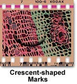 Dark or light crescent-shaped marks (or "half-moons") can appear anywhere on the negative, including near the take-up spool sprocket perforations, and are due to mechanical wrinkling or creasing of the film. This error usually occurs during loading of film into the tank prior to processing or during removal of processed film from tank reels. The size of the mark is an indication of the severity of damage to the film base, especially when some of the emulsion has been removed. If the damaged area does not cover the entire negative, it may still be possible to get a usable print by cropping to include only good portions of the film during printing.
