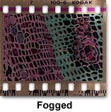 Fogging is the result of a light leak, either in the film development tank, darkroom (light leaking through the door, an inadequately blocked window, or a safelight), or in the camera back. Usually several frames are destroyed by fogging, but not the entire roll. Check all potential problem areas to ensure the mistake is not repeated with the next roll. Light leaks in the development tank can occur because the lid is not properly secured, or because the light-tight solution tube that runs through the center of the film reels is not seated properly. In rare cases, development tanks are cracked when they are slammed against the counter to dislodge air bubbles. Darkroom light leaks can be detected by turning off the lights and waiting for 15 minutes, allowing the eyes to become accustomed to the darkness before checking around door and window edges.