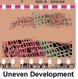 Uneven development is manifested by light patches and streaks on the color negative film and is caused by insufficient agitation of the film developing solution. When the agitation level is not high enough, depleted chemicals near the emulsion surface are not replenished in time to complete the development process and can accumulate and slide across the film. This retards film development in large areas causing streaks that compromise the integrity of the negatives. Although film that is streaked cannot be repaired, future development sessions can be successful if the manufacturer's recommended agitation rates are followed. Negatives that have been streaked by uneven development usually yield unsatisfactory prints, but if the affected area is small, then judicious cropping can often produce a reasonable print.