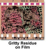 Grit and dirt on the negative surface is usually caused by inadequate washing or improper use of wetting agents. Make certain that wash water circulates well and is replenished often, and that wetting agents are properly diluted (they can leave a residue when used too concentrated). Damp film readily attracts dust and dirt, so thoroughly dry film before handling. Areas that have extremely hard water are prone to this type of problem. Filtering water before using it for photography processing is always a good idea, but in areas with hard water, it can become critical. Mix commercial wetting agents with distilled water for the best results.