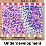 Underdevelopment when processing color negative film using the C-41 method leads photomicrographs that are low in contrast, although the image does contain some detail in highlight regions and midtones. Typically, when the color developer time is cut too short, resulting negatives appear obviously underdeveloped and are very thin. Another cause for underdevelopment with color negative film occurs when the water bath temperature falls below the recommended level of 37.8 degrees Centigrade. The C-41 color developer step is so sensitive to temperature that even if the drop is only 0.5 degrees, there will be a noticeable decrease in film density. It is a good idea to pre-heat both the color developer (and other processing solutions) as well as the developing tank for at least 15 minutes prior to initiating film processing. Similar results are obtained when the film is insufficiently agitated during the development process. The color developer must be poured into the developing tank very quickly and agitation must start immediately. Underdeveloped film should be carefully examined on a light table (5500 K) to determine if it is salvageable. There is a possibility that underdeveloped film can be restored, at least to a certain degree, with chemical dye reducer.