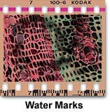 Water marks are light or dark gray spots that occur when water containing a significant amount of dissolved salts (hard water) dries on the emulsion surface. Careful use of hypo clearing agent or similar wetting agents followed by squeegeeing the film will help alleviate this problem, but will not guarantee a cure. Spots having a dark outline are caused by water coming into contact with the film surface after the emulsion has dried. This mistake usually occurs during cutting and packaging of the film and can be avoided by careful handling of film after processing and drying. Water marks can often be removed with film cleaner without compromising the integrity of the emulsion surface.