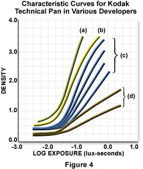Because each film has a unique response curve, exposure characteristics of individual films can be used to manage image contrast in photomicrography. Specimens inherently lacking in contrast can be photographed with a film having a large characteristic slope to increase contrast in the resulting photomicrograph. Alternatively, with specimens that have too much contrast, a film having a flatter slope can be used to reduce the amount of contrast in the final image. Kodak Technical Pan black & white film displays contrast properties that can be altered over a wide range by proper choice of development conditions, as illustrated in Figure 4. Figure 4(a) shows a response curve for Technical Pan that has been processed in Kodak Versamat 895 developer. The slope of the response curve under these conditions is very steep and images captured on the film will have a great deal of contrast. Successively lower amounts of contrast are produced when other developers are used (Figure 4 (b)-(d). Figure 4(b) illustrates the Technical Pan response curve when Duraflo RT is used as the developing agent, which produces less contrast than Versamat 895 developer. Still lower degrees of contrast are obtained when HC-110 developer is used at varying processing times (Figure 4(c)), and the least amount of contrast exhibited by this film occurs when it is processed with Technidol (Figure 4(d)).