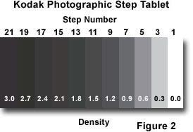Characteristic curves are obtained by carefully exposing a section of film through a step tablet similar to the one illustrated in Figure 2. After exposure, the film test section is carefully developed under strictly controlled conditions to yield a film strip having a series of steps with sequentially increasing density. Average density of the resulting exposed and processed film is scanned and calculated using an instrument known as a sensitometer. The step tablet produces a series of logarithmic exposure steps on the film, each step differing from the preceding step by a factor of two, or one f-stop. Exposure is described in terms of lux-seconds , which is a measure of the amount of exposure a section of film would receive under a controlled set of conditions. One lux-second is the amount of light received by film placed one meter from a standard candle for a single second.