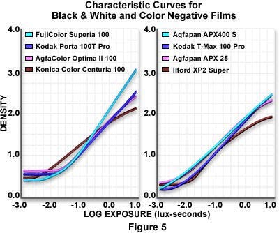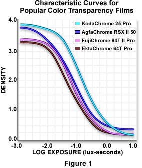 Thus, an increase in light intensity, other things being equal, would call for a shorter exposure time. Similarly, a decrease in light intensity would require a longer exposure time. This linear relationship is known as the reciprocity law and applies to both black & white and color films over a wide range of exposure times and illumination intensities. The response of a film emulsion to exposure and development is often plotted as a graph of film density verses the exposure time (or its base 10 logarithm), and is typically referred to as a characteristic curve . Plotting exposure data by this method was originally suggested by Ferdinand Hurter and Vero Driffeld, and curves of this type have also been termed H and D , Gamma , and D log E curves. Examples of several characteristic curves for popular color transparency films commonly used in photomicrography are illustrated in Figure 1 with a plot of density versus log of the exposure time in lux-seconds. Each film has a unique characteristic curve when processed or developed under a set of standardized conditions. For ease of illustration, the characteristic curves presented in Figure 1 are averaged values for the red, green, and blue emulsion layers, each of which respond in a slightly different manner and display unique values when plotted as density versus log exposure.
