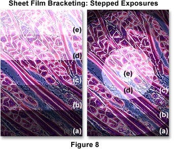Bracketing is conducted in a different manner when using sheet film. The entire bracket can be performed on a single section of sheet film using either the dark slide of the film holder or the microscope field diaphragm. If the sheet film is held in place using a film holder having a dark slide, first remove the slide and expose the film for a standard unit of time. For instance, if the correct exposure is believed to lie between 2 and 3 seconds, initially expose the entire film section for a single second. Next, push the dark slide into the film holder until it has covered about 1/5 to 1/6 of the film (about an inch), and expose the film again for one second. Push the dark slide in another inch, or 1/5 of the film length, and expose for two seconds. Repeat by pushing in the slide once again and exposing the film for four seconds and so on until the entire sheet has been incrementally exposed. In this manner, the film will have regions exposed in a geometric progression of exposure times (1, 2, 4, 8, seconds etc.), until the entire sheet of film has become an exposure bracket. Process the film and place the sheet on a 5500 K light table. Examine the exposure bracket carefully with a loupe to determine the correct exposure.