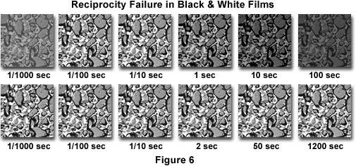As mentioned above, very long exposure times are more likely to occur in photomicrography due to low illumination intensity levels that result with contrast enhancing techniques such as fluorescence and polarized light. In fact, exposure times exceeding five minutes are not uncommon, and usually lead to reciprocity failure. When using black & white films, calculated exposure values can lead to negatives lacking shadow detail (Table 1 and Figure 6), but compensation by lengthy exposure often yields too much density in highlight areas, resulting in an increase in overall contrast. This is due to the fact that the reciprocity failure effect is greater in regions where specimen illumination is very low, a problem that can be overcome by increasing the amount of time the film is developed (see Table 1).