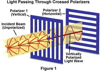 This type of polarized light is often termed glare and can be easily demonstrated by viewing the distant part of a highway on a sunny day. The reflection and polarization of light according to the Brewster theory can be more thoroughly examined with our Brewster Angle Java Tutorial. Light reflected by the flat surface of a highway is partially polarized with the electric field vectors vibrating in a direction that is parallel to the ground. This light can be blocked by polarizing filters oriented in a vertical direction as illustrated below in Figure 2 with a pair of polarized sunglasses.