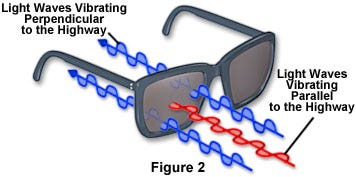 The lenses of the sunglasses have polarizing filters that are oriented vertically with respect to the frames. In the Figure 2 above, the blue light waves have their electric field vectors oriented in the same direction as the polarizing lenses and, thus, are passed through. In contrast, the red light wave is perpendicular to the filters and is blocked by the lenses. Polarizing sunglasses are very useful when driving in the sun or at the beach where sunlight is reflected from the surface of the road or water leading to glare that can be almost blinding.