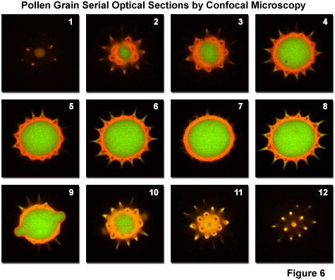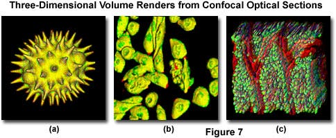In specimens more complex than a pollen grain, complex interconnected structural elements can be difficult to discern from a large series of optical sections sequentially acquired through the volume of a specimen with a laser scanning confocal microscope. However, once an adequate series of optical sections has been gathered, it can be further processed into a three-dimensional representation of the specimen using volume-rendering computational techniques. This approach is now in common use to help elucidate the numerous interrelationships between structure and function of cells and tissues in biological investigations. In order to ensure that adequate data is collected to produce a representative volume image, the optical sections should be recorded at the appropriate axial (z-step) intervals so that the actual depth of the specimen is reflected in the image.