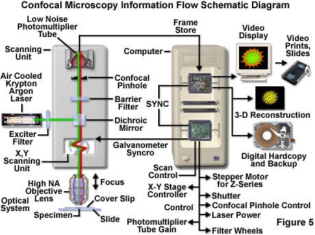 Basic microscope optical system characteristics have remained fundamentally unchanged for many decades due to engineering restrictions on objective design, the static properties of most specimens, and the fact that resolution is governed by the wavelength of light. However, fluorescent probes that are employed to add contrast to biological specimens and, and other technologies associated with optical microscopy techniques, have improved significantly. The explosive growth and development of the confocal approach is a direct result of a renaissance in optical microscopy that has been largely fueled by advances in modern optical and electronics technology. Among these are stable multi-wavelength laser systems that provide better coverage of the ultraviolet, visible, and near-infrared spectral regions, improved interference filters (including dichromatic mirrors, barrier, and excitation filters), sensitive low-noise wide band detectors, and far more powerful computers. The latter are now available with relatively low-cost memory arrays, image analysis software packages, high-resolution video displays, and high quality digital image printers. The flow of information through a modern confocal microscope is presented diagrammatically in Figure 5.