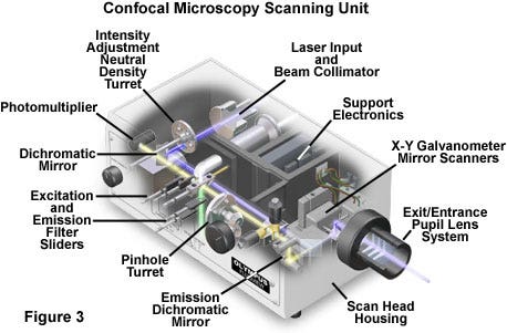 The scan head is at the heart of the confocal system and is responsible for rasterizing the excitation scans, as well as collecting the photon signals from the specimen that are required to assemble the final image. A typical scan head contains inputs from the external laser sources, fluorescence filter sets and dichromatic mirrors, a galvanometer-based raster scanning mirror system, variable pinhole apertures for generating the confocal image, and photomultiplier tube detectors tuned for different fluorescence wavelengths. The general arrangement of scan head components is presented in Figure 3 for a typical commercial unit.