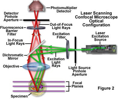 The confocal principle in epi-fluorescence laser scanning microscopy is diagrammatically presented in Figure 2. Coherent light emitted by the laser system (excitation source) passes through a pinhole aperture that is situated in a conjugate plane (confocal) with a scanning point on the specimen and a second pinhole aperture positioned in front of the detector (a photomultiplier tube). As the laser is reflected by a dichromatic mirror and scanned across the specimen in a defined focal plane, secondary fluorescence emitted from points on the specimen (in the same focal plane) pass back through the dichromatic mirror and are focused as a confocal point at the detector pinhole aperture.