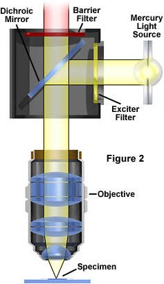 The universal reflected light illuminator (see Figure 1) has at its far end a universal lamp-house which contains a light source, usually a mercury burner (other light sources might be a xenon burner or a halogen bulb.) The light travels along the illuminator parallel to the table top and perpendicular to the optical axis of the microscope. The light passes through collector lenses and a variable, centerable aperture diaphragm and then through a variable, centerable field diaphragm. It is incident upon the excitation filter which selects those excitation wavelengths that are wanted to reach the specimen and blocks the wavelengths not wanted to reach the specimen. The selected wavelengths reach the dichromatic beamsplitting mirror. This mirror is a special type of interference filter which efficiently reflects shorter wavelength light and efficiently passes longer wavelength light. The dichromatic beamsplitter (also sometimes called the dichroic mirror ) is tilted at a 45 degree angle to the incident excitation illumination and reflects this light at a 90 degree angle directly through the objective and onto the specimen. The fluorescent light emitted by the specimen is gathered by the objective, now serving in its usual image forming function. Because the emitted light consists of longer wavelengths, it is able to pass through the dichromatic mirror.