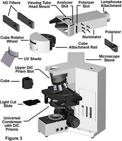 The illuminator is designed to direct light onto the specimen by first passing the light through the microscope objective on the way toward the specimen and then using that same objective to capture the light being emitted by the specimen (diagrammed in Figure 2).