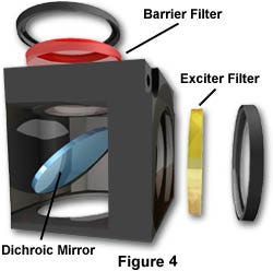 Any scattered excitation light reaching the dichromatic mirror is reflected back toward the light source. Before the emitted light can reach the eyepiece, it is incident upon and passes through the barrier or suppression filter. This filter blocks (suppresses) any residual excitation light and passes the desired longer emission wavelengths toward the eyepieces. In most reflected light fluorescence illuminators, the excitation filter, dichromatic mirror, and barrier filter are incorporated in a cube, as illustrated in Figure 4. The more sophisticated systems accommodate three or four fluorescence cubes (on a revolving turret or on a slider) and permit the user to attach replacement custom made exciters, barrier filters or dichromatic mirrors.