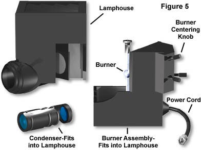 The universal illuminator lamphouse should incorporate an infrared filter to block the very long, heat generating wavelengths. Some lamphouses have a built-in red suppression filter (e.g. an BG38 ), or a slot for such a filter, to eliminate a reddish background seen in the field of view in some applications. The lamphouse itself should not leak harmful ultraviolet wavelengths and, preferably, should incorporate a switch to automatically shut down the lamp if the housing is inadvertently opened during operation. The lamphouse should be sturdy enough to withstand a possible burner explosion during operation. The lamp socket should have lamp centering screws to permit centering the image of the lamp arc or halogen lamp coil to the back aperture of the objective (in Köhler illumination these planes are conjugate).