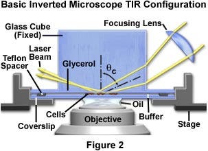 Regardless of the basic microscope design, a majority of the currently utilized TIRFM configurations rely on an added prism to direct laser illumination toward the interface where total internal reflection occurs, which is in the specimen conjugate plane of the microscope. It is also possible to use the microscope objective to simultaneously direct illumination to the interface and capture secondary fluorescence emission produced by excited fluorophores. This discussion reviews many of the basic microscope configurations for TIRFM, and assumes that the example specimen consists of cells in tissue culture labeled with one or more fluorescent dyes and growing in a monolayer attached to a glass coverslip at the total internal reflection interface.